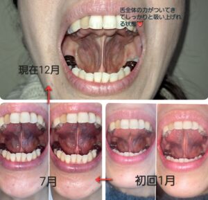 初回は舌が喉の奥へ落ち込んでいる状態です。口蓋垂※は全く見えません。施術中はどこも痛気持ちくて「ほぐされているのが良くわかる」と感じて下さっていました。腹部(横隔膜)より上だけの施術なのに「全身触って